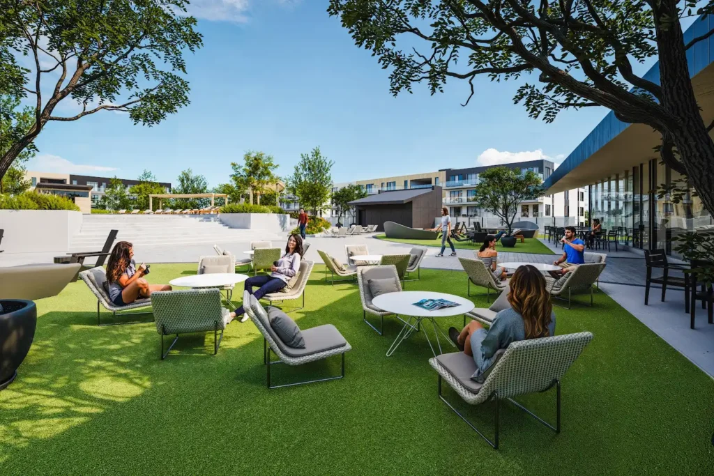 Ici, vous profiterez d’une vaste terrasse extérieure de 40 000 pieds carrés, et du Pavillon proposant 12 000 pieds carrés d’installations intérieures, alliant harmonieusement entraînement, relaxation et divertissement.